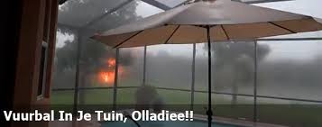 Het heeft vannacht behoorlijk geregend en het onweer hing vlak hierboven ....hetgeen natuurlijk mooie en spectaculaire plaatjes opleverde tussen de grote groene bomen....het stormde hevig en als ik zo naar beneden kijk,dan lijkt het wel herfst... het gazon ligt vol bladeren..